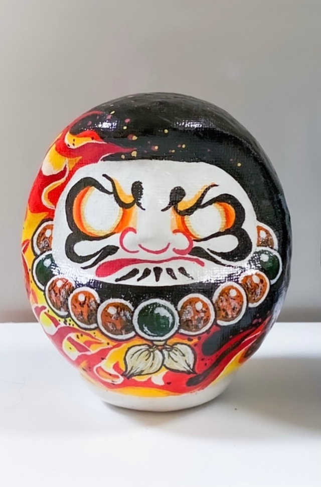 Sサイズ(9㎝) 入れ墨、刺青風の炎を描いた達磨です。 強面で迫力のある作品です。 同じく出品中の波の達磨さんとついになっていますので、よろしければご覧ください。