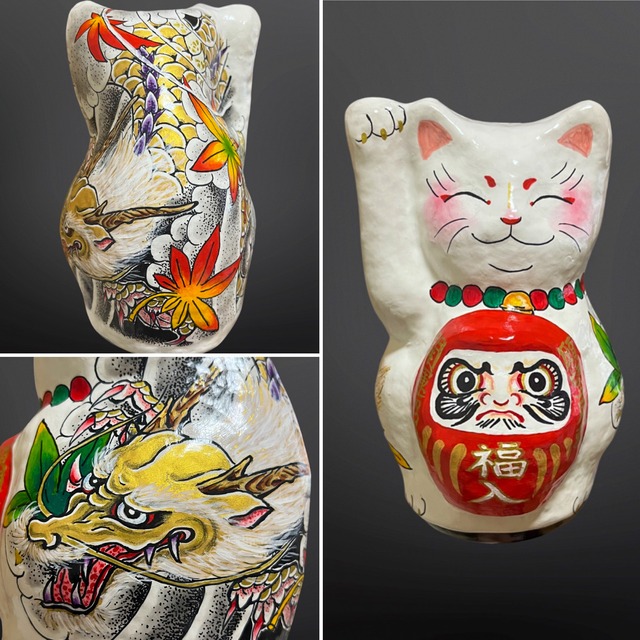 招き猫を描きました。 一点一点心を込めて手描きした世界に一つだけの猫さんです。 背中の柄は来年の干支、龍を描きました。 色褪せ予防のUV処理をしております。 ご自宅用やプレゼントに◎ 作品size 高さ18cm ご質問等、お気軽にご連絡ください! #daruma #だるま #ダルマ #アート #illustration #イラスト #達磨 #高崎だるま #開運 #縁起物 #合格祈願 #ハンドメイド #プレゼント #願掛け #手づくり#美術館 #出産祝い #お祝い #インテリア #雑貨 #置き物 #アート展 #tattoo #刺青 #和彫 #入れ墨 #花束 #招き猫